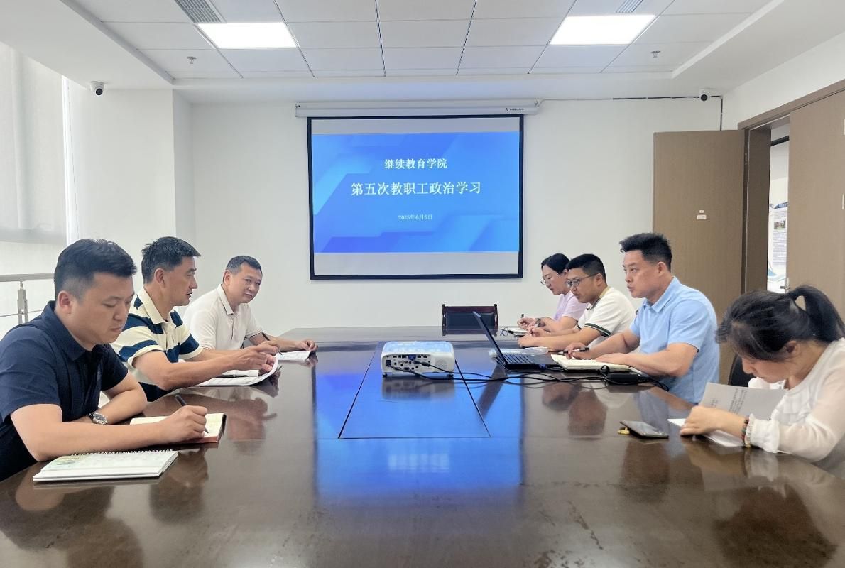 6月6日下午,继续教育学院召开2025年教职工第五次政治学习。此次学习由学院直属党支部书记杨冰主持。